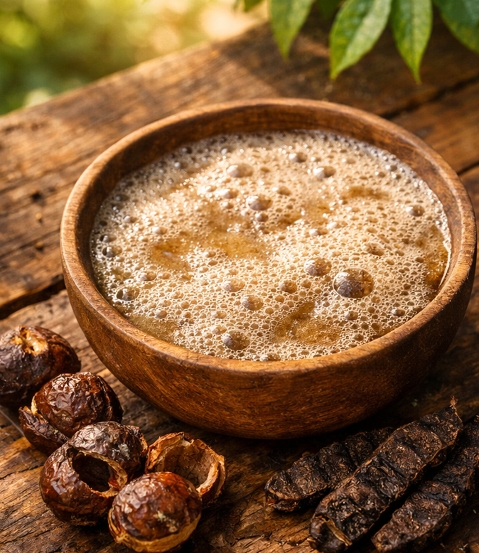 For thousands of years, long before sulfates and parabens were invented, Indians maintained thick, lustrous hair using simply berries and nuts. We are bringing that wisdom back. Our shampoo is a raw, coarse powder of Reetha (Soapnut), Shikakai (Fruit for Hair), and Amla (Indian Gooseberry). Reetha contains natural saponins that gently lift grease and dirt. Shikakai acts as a natural detangler and conditioner. Amla provides the gloss. There are no hidden surfactants, no foaming agents, and absolutely no chemicals. It is raw nature, bottled.
