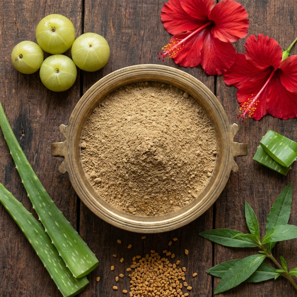 A complete herbal blend including Amla, Hibiscus, Bhringraj, Brahmi, Aloe Vera, and more.